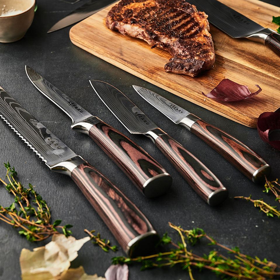 The Ikigai Professional Knife Set includes every type of knife you may need for your cooking endeavors. When you use the right knife for the right task, meal prepping becomes a breeze.
